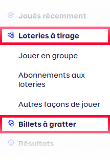 La page Jeux a été remplacée par deux sections distinctes dans le menu de navigation : Loteries à tirage et Billets à gratter. Cette réorganisation vise à vous offrir une expérience utilisateur plus claire et plus fluide, et à vous faciliter l’accès aux produits d’une même catégorie.